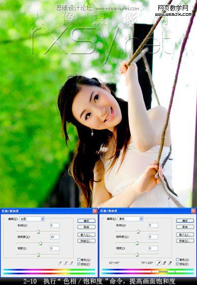 10.最后,用“色相/飽和度”命令調整圖像的色相及飽和度,使色彩艷麗而不失真實。 “全圖”設置“飽和度”值為“10”,選取“黃色”,設置“色相”值為“5”,其他設置均保持默認值,綠樹更為蔥郁,如圖2-10所示。