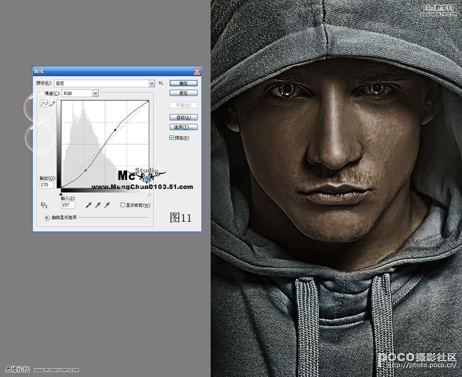 9.蓋印圖層,打開“通道”面板,找到綠通道,ctrl+a,ctrl+c,復制后回到“圖層”面板,粘貼。正片疊底,39%, 對該層進行曲線調整,做一個s形的曲線。參數與效果圖如下圖十一: