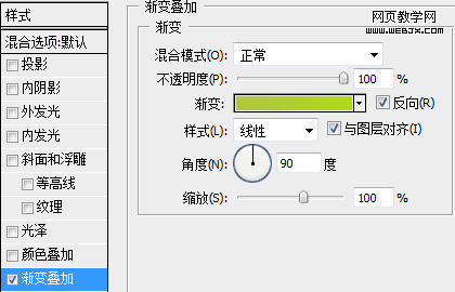 “漸變疊加”,然后按下圖設置.漸變的顏色選擇2個同色系但是有”深淺對比”的顏色.例如例子中,一個淺綠跟深綠.這樣才能模擬光照效果.