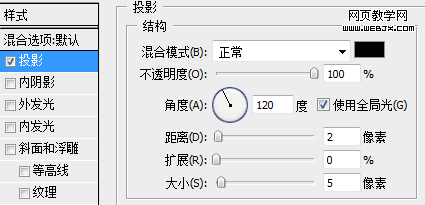好了,剩下陰影.還是一樣在樣式面板左側點”投影”,然后按下圖設置: