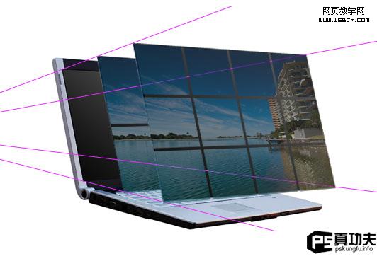 第三步現在,我們需要做一些透視輔助線(反思下自己有考慮這些技巧么),選擇直線工具,線條顏色選亮一點的,把大屏幕的每個角和原來筆記本的四個角連接起來,最后匯集到一點。如圖
