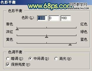 2、用套索工具勾出圖4所示的選區,按ctrl + alt + d 羽化30個像素,然后創建色彩平衡調整圖層,參數設置如圖5,確定后把圖層不透明度改為:40%,效果如圖6。