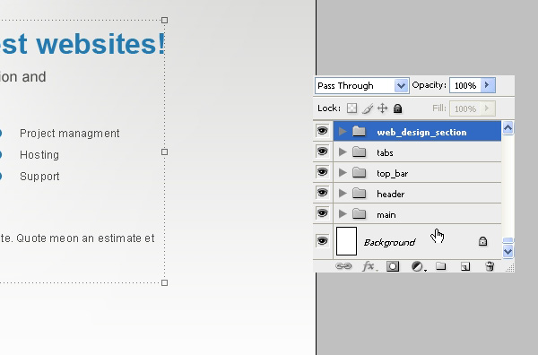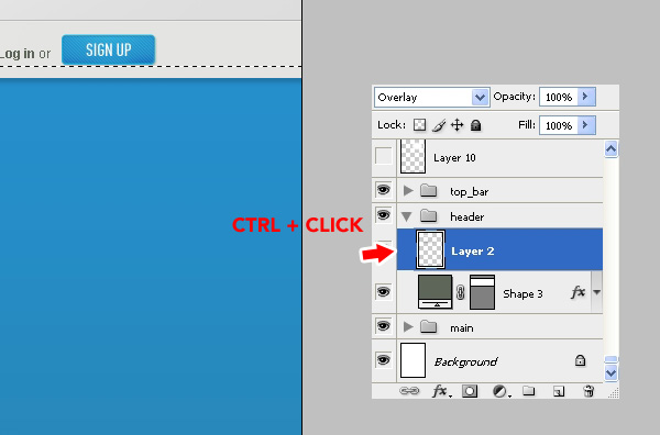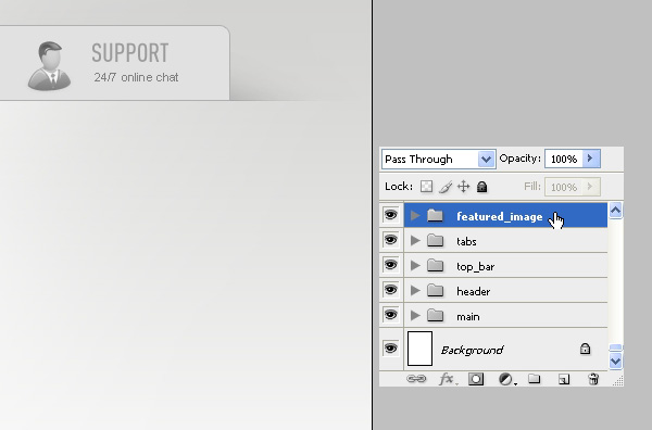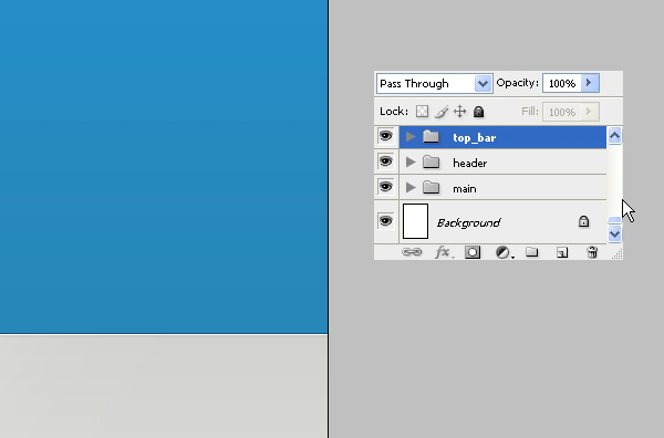 現在我們回到層結構那里提早做一些工作.創建一個空的層文件夾并命名為”top_bar” .移動所有的圖層到這個文件夾里面(包括logo,條紋,搜索框,注冊按鈕,導航和背景).