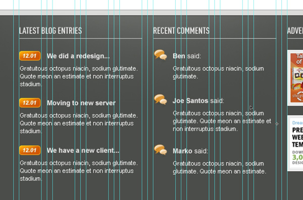 我一直以來做的設計幾乎全部是基于960網格模板的. 因此在我們開始創作之前,先下載這個模板. 你能在960.gs上找到這些模板. 下載之后解壓zip里面關于psd的模板. 你會發現有兩種規格: 一個是12欄式的而另一個是16欄式的. 他們的區別就像名字所說的,一個是按12欄分布一個按16欄. 更詳細的介紹一下吧, 如果你的設計里面分3個區塊你就選擇12欄式的,那是因為12能被3整除; 同理假如你的設計分四個區塊, 你可以選12欄式或者16欄式,那時因為12和16都可以被4整除. 你會發現這個技巧將用于下面教程.