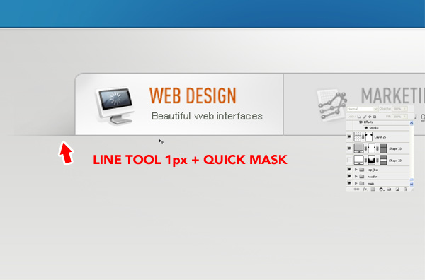 最后我們加點細節。在切換菜單下方畫一個1px的灰線。然后如上一步一樣用蒙版的方式使左右兩端漸變。現在我們就得到一條比較時尚好看的線了。