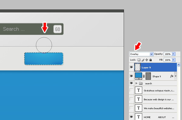 在上面再建一層, 把混合模式設置成疊加 ,然后好像第五步那樣加照亮效果,不過這次用的是小筆刷 . 然后就是增加導航文字了.我用 arial 字體作為導航的連接字體, 所有效果設置為 “無”.
