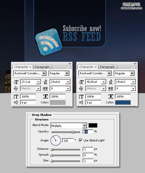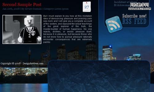 13.我們來給網(wǎng)頁添加個rss的圖標,在右邊加一些文字,可以用"rockwell condensed"字體.