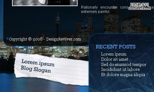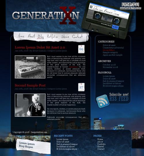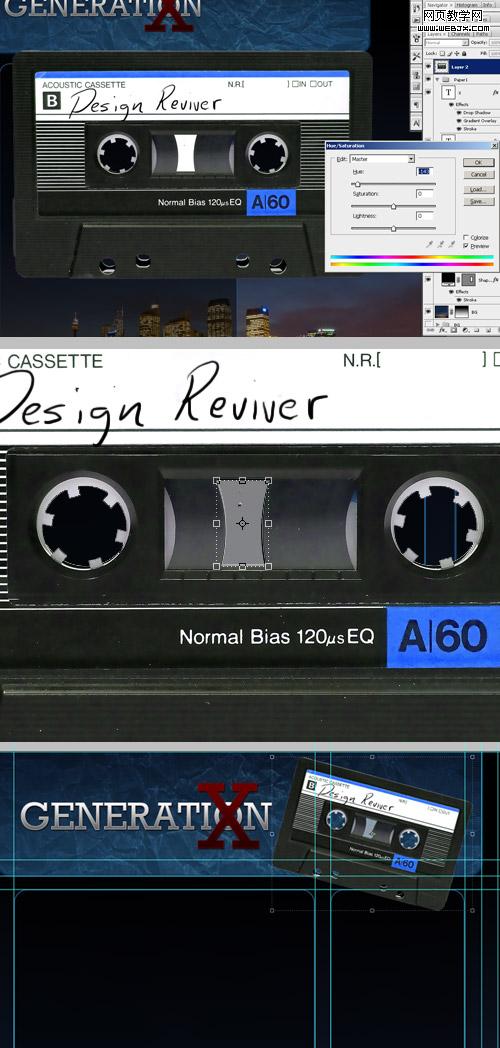 8.現(xiàn)在我們來給網(wǎng)頁添加些圖像.打磁帶文件,放在所有的圖層上面,然后添加一些文字.用鋼筆工具把磁帶中的透明部分摳出來,剪切并粘貼,利用變形工具對它進行變形,最后調節(jié)其的不透明度50%,60%,接差合并圖層,把磁帶圖層放在網(wǎng)頁的右側邊上.如圖: