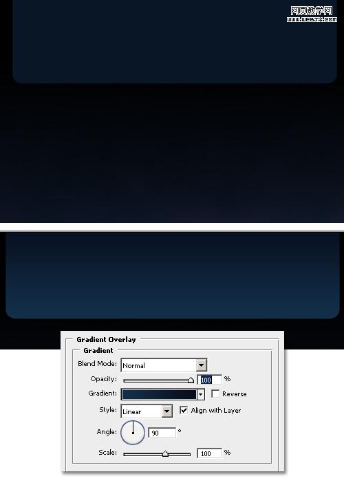 3.新建一個圖層,在其上畫一個圓角矩形,并給這個圓角矩形添加一個漸變的樣式.如圖: