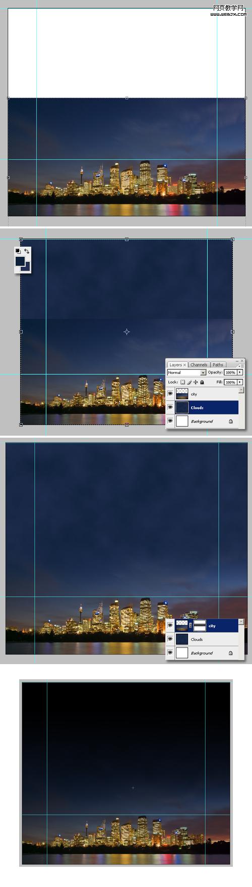 2.打開圖片,并調整它的位置和大小.新建一個圖層,點取調色板分別設置前景色為紫色,背景色為藍色.然后選擇"濾鏡>渲染>云彩".并命名為cloud.把它拖到city圖層下面.并給city圖層添加蒙版.再給cloud也添加蒙版.如下圖: