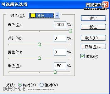 7、再對可選顏色的的紅色、黃色進行調整(目的是提高一下色彩之間的對比),參數如下,效果如圖: