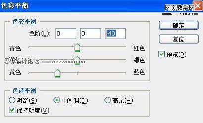 6、再執行色彩平衡(目的是向你需要的色彩轉移)參數如下,效果如圖: