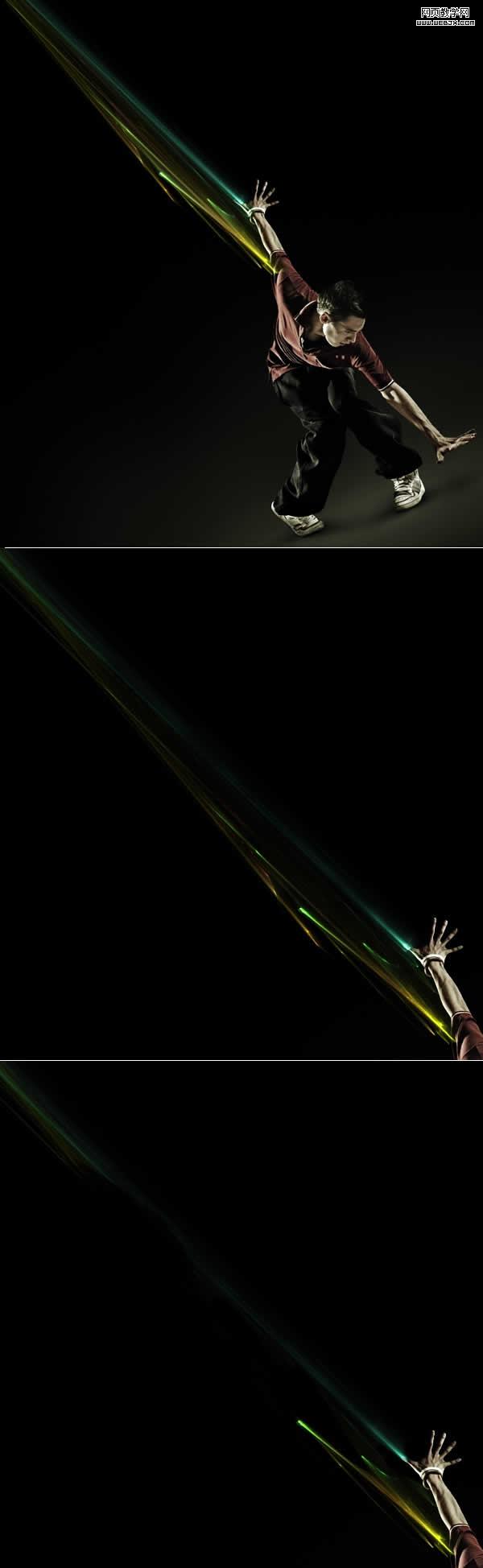 現在看起來這個人物真正的融合進了圖像中,這就是我們想要的。接下來,我開始展示制作光線技巧。 這是我為這一塊所準備的 abstract(這是光線的圖片)。因此打開這些光線并拖到項目中去,同時,改變其混合模式為線性減淡。這要放在所有層之上,除了之前兩個對顏色的調整圖層外。 現在看看這個過程。我已經有了這些抽象的燈光,我用加深工具(中間調)加深我不想要的部分(下面第二張圖片)。剩下許多這些短光線,因此我用硬邊的橡皮擦工具擦除我不想在這里看到的線(下面第三張圖片)。最后,我添加了圖像>調整>色彩平衡,精確調整這三條主線的色彩(藍色,綠色和黃色)。使這些線與眾不同而且明亮。 還要把每一條線分離,但在此之前,它們需要被裁剪到新層上。