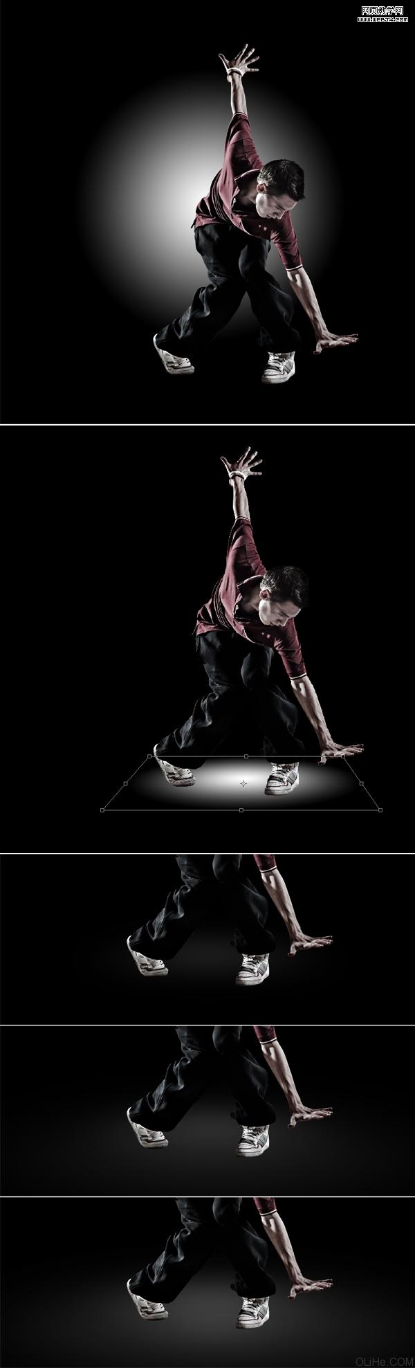 好,接下來我們將創建地面。我用漸變工具在一個新層上創建一個由白色到透明的徑向漸變(如你在下面第一張圖片所看到的)。然后,這個大的白點需要一點透視效果,所以在這里我按command(ctrl) + t鍵扭曲它(下面第二張圖片)。 使用半徑為40像素的高斯模糊來模糊點。然后,我復制這個模糊點,延伸它一點點(command + t鍵),并做了兩個以上的副本來加強地面的效果。如有必要,這些地面圖層的不透明度可以降低一點。這意味著它的表面不能太亮,因為這將會稍微破壞整個黑色的背景。