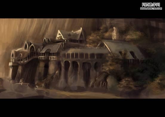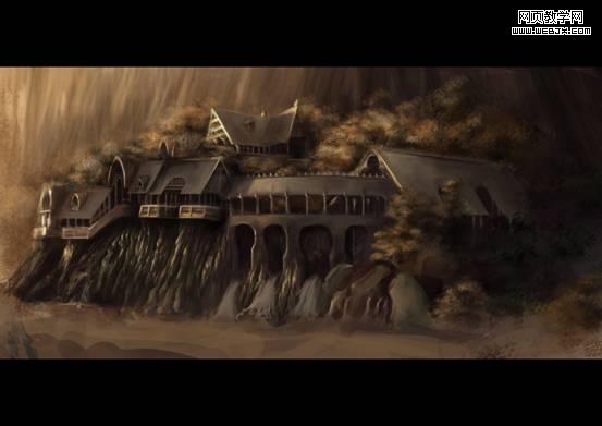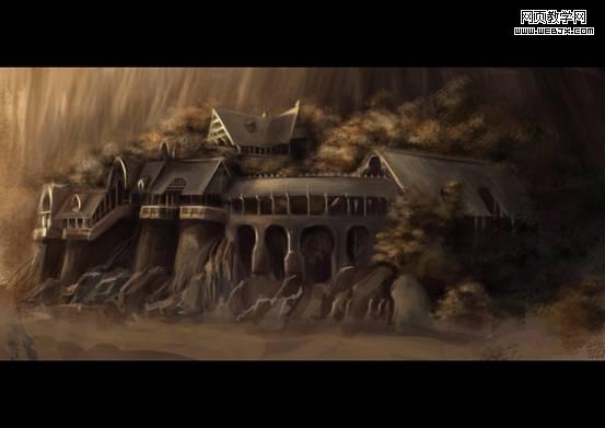開始更細致的繪制,加強了城堡的質感,以及樹木的層次關系,同時讓光源關系更明顯。