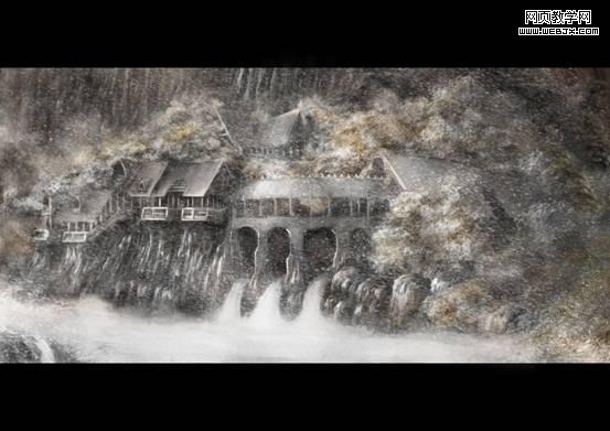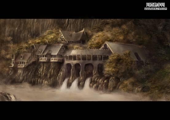 把筆刷調節成(我很習慣用這個筆刷繪制較硬材質的物體),把城堡下發的山體繪制出來,并把前景的河流確定出來。