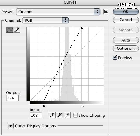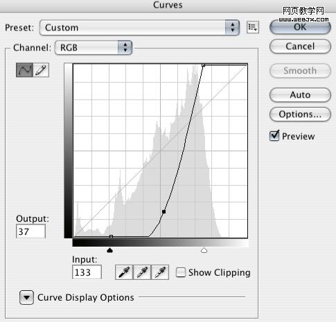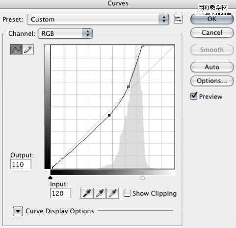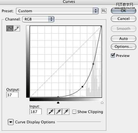 在背景上新建一個曲線調整層。在這里用的是自動曲線圖層蒙版。如同第一步那樣調節曲線,但這一次我們調節的選區里面的內容,而選區外的陰影是不受影響的。并命名這個圖層為:light source。