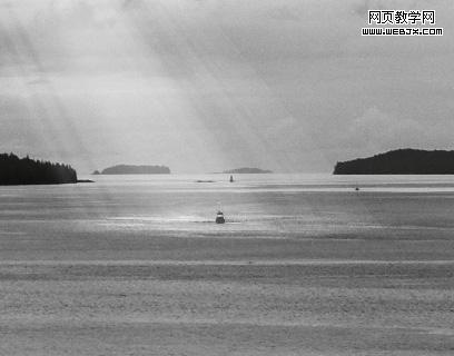 選擇漸變工個,給這個光束漸變黑到白。(可以在漸變工具欄設置。)拖動漸變從頭部到水底,選擇菜單樣上的edit>fadegradient.給淡出淡入減50%,在這里創建的一個光束的衰減,利用了淡出淡入這個功能就不會使光束消失在底部。