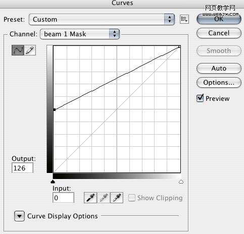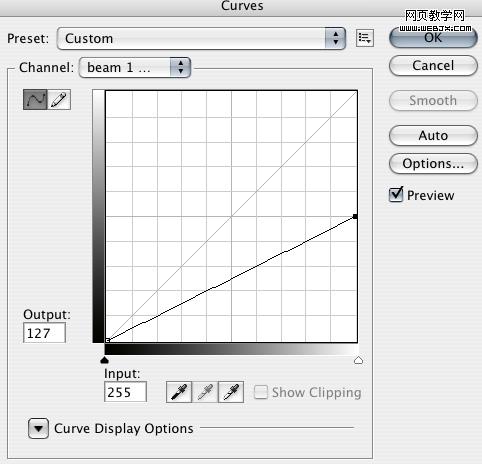 選擇beam 1圖層,按ctrl+m彈出曲線對話框,并設置如下,讓中心的光源看起來比邊緣更亮。
