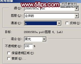3、新建一個圖層,按ctrl + alt + shift + e 蓋印圖層。選擇菜單:圖像 > 模式 > lab顏色,選擇不合拼,然后執行:圖像 > 應用圖像,參數設置如圖4,效果如圖5。