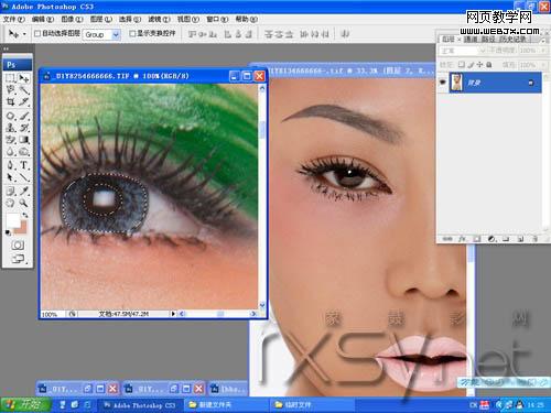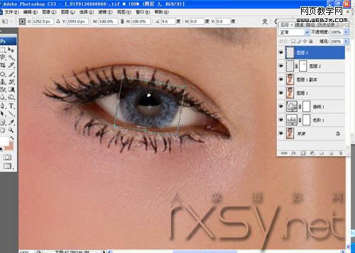 5、為了使眼球更具有層次感,我們通過添加美瞳來實現(xiàn),常見的美瞳有各種顏色的,紋理以放射狀居多,同時具有放大眼球的效果。這里我們選擇現(xiàn)有美瞳的眼睛進行復(fù)制,最好是同一角度的,適當變換調(diào)整使其相匹配。注:復(fù)制時只選擇瞳孔外側(cè)的區(qū)域即可,不需要將整個眼球全部復(fù)制。