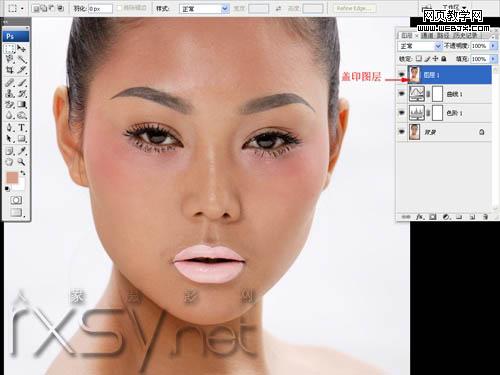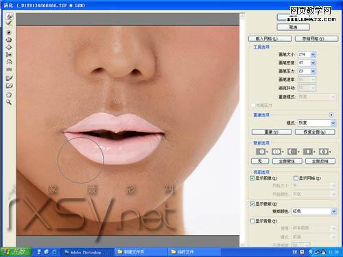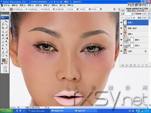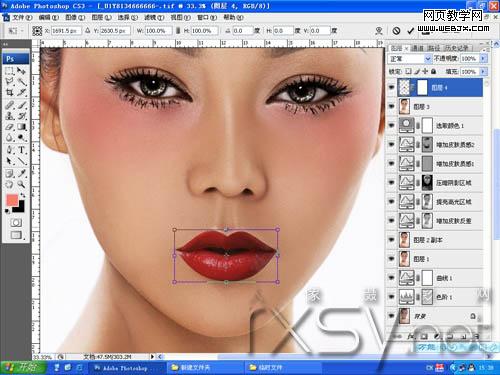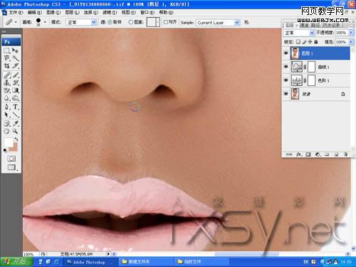 2、由于唇在面部有些搶眼,這里我們選擇一張同等角度的唇進行替換,因紅色可在保證像素正常的情況下調(diào)整到我們需要的色彩。注:原唇色為白色,明度太高,如需其它色彩則要壓暗處理,容易出現(xiàn)色彩分離的狀況。