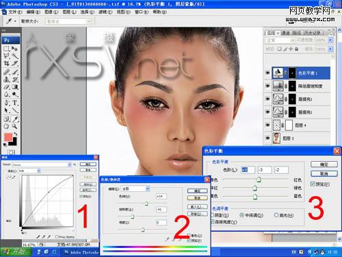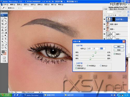3、通過曲線提亮、色相飽和度以及色彩平衡的調(diào)整達到理想中的唇色,肉粉色與膚色非常吻和。同時整體的視覺重點也調(diào)整到眼部。