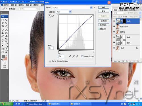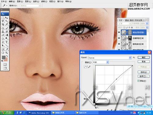 4、 對剛才選區(qū)進行反選,選中毛孔陰影進行壓暗,通過這種方式來使每個毛孔的對比加大,整體質(zhì)感剛會達到強化的效果。注:注意曲線調(diào)整的幅度,否則毛孔對比太大,使皮膚看起來很臟