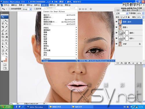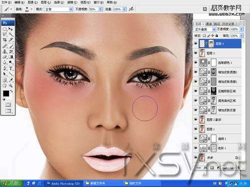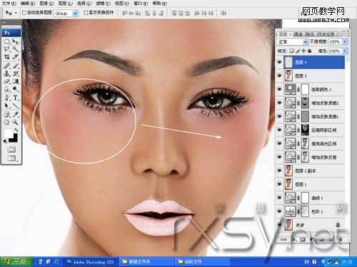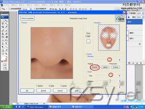 接下來主要是對皮膚的修飾,修整皮膚有很多種方法,不管是什么方法只要能達到好的最終結(jié)果則都是可取的,這里我們結(jié)合了磨皮軟件,細節(jié)區(qū)域可單獨處理。