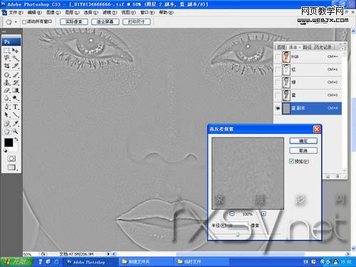 2、 接下來我們這步主要為了加強皮膚質(zhì)感,復(fù)制藍通道并做高反差保留,半徑10像素左右,此步可將面部毛孔的高光及陰影計算出來,以便單獨調(diào)整。