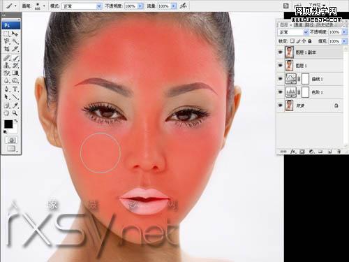 1、觀察雙側(cè)腮紅顏色不夠柔和統(tǒng)一,我們來適當調(diào)整,新建圖層,選擇一款接近的顏色,用畫筆涂抹,并改圖層模式為正片疊底(目的讓顏色與皮膚更加服帖),圖層蒙版控制邊緣過渡。