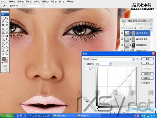 3、提取藍副本選區(qū),回到rgb復(fù)合通道,打開圖層,曲線提亮,這步是讓毛孔中的高光更亮。
