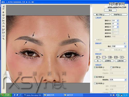 2、眼睛形狀的調(diào)整,圖片中箭頭標示的方向則是液化時要提拉的角度。眼睛的液化非常關(guān)健,由于眼睛在面部五官中占據(jù)了重要的比例關(guān)系,我們可遵循三庭五眼的標準來調(diào)整。