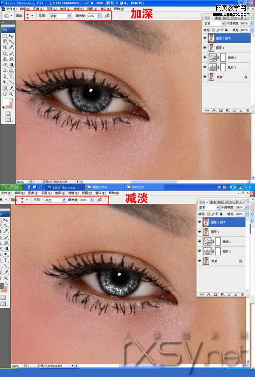 6、加深減淡工具增強眼球立體感,根據(jù)深色給人后退感,亮色給人前進感的原理,將眼球的明暗進一步加強。