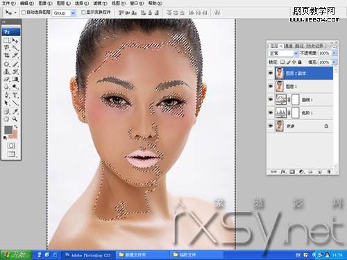 1、 復(fù)制一層,利用快速蒙版選中皮膚區(qū)域。注:保留眉毛、眼睛、嘴唇及臉部邊緣部分。