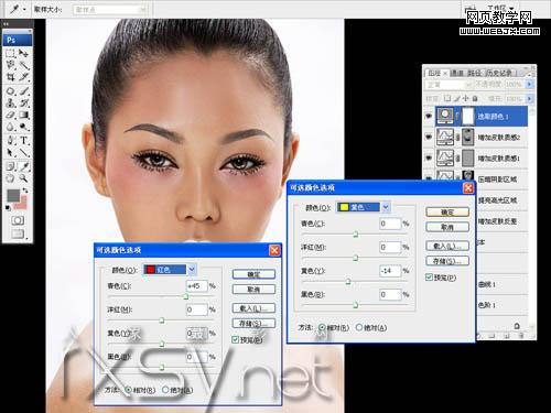 5、 當皮膚中紅色居多時則會顯的皮膚有焦糊感,這里利用可選顏色,把皮膚中的紅色和黃色數(shù)值進行適當降低。注:可選顏色:青色+45,黃色-14,可根據(jù)具體情況適當調(diào)節(jié)。