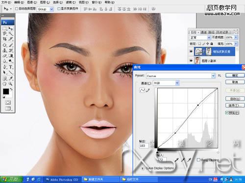 1、查看色階,直方圖中顯示陰影及高光區(qū)域缺少像素,所以致使皮膚發(fā)灰,我們適當調(diào)整,使照片恢復(fù)正常的黑白對比。然后再利用曲線(圖層<新建調(diào)整圖層)為照片提亮,主要針對皮膚部分,在提亮之前可在皮膚上點擊查看對應(yīng)皮膚的斜線節(jié)點位置再做調(diào)整,暗部明暗不變。