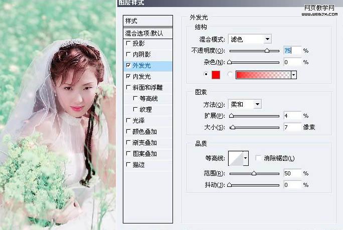 5、新建一層,用星光畫筆點綴,加圖層樣式,內發光,外發光,顏色都是紅色。