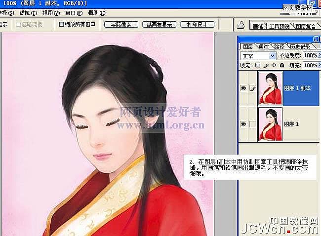 2、在復(fù)制的圖層中用仿制圖章工具把眼睛涂抹掉,用畫筆和鉛筆畫出眼睫毛,不要畫得太夸張,如下圖。
