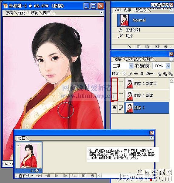 4、轉(zhuǎn)到ImageReady,并且把上面的兩個圖層設(shè)置成不可見,打開動畫面板把背景圖層的動畫延時時間設(shè)置為:.2秒。