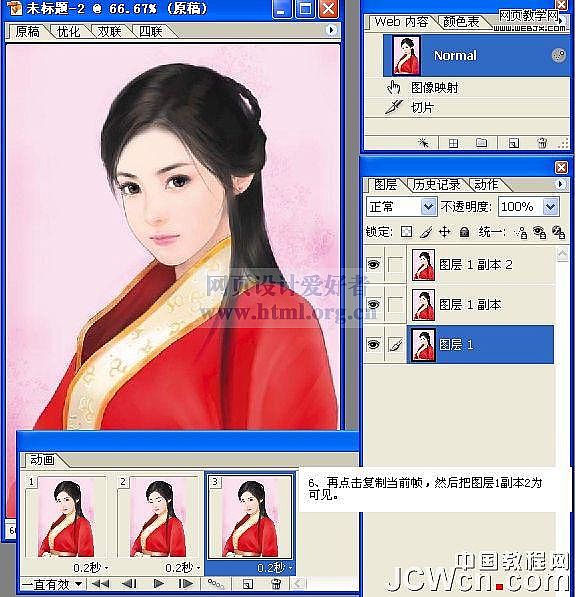 5、點動畫面板上的復(fù)制按鈕,把當(dāng)前幀復(fù)制一層,把中間圖層顯示出來,如下圖。