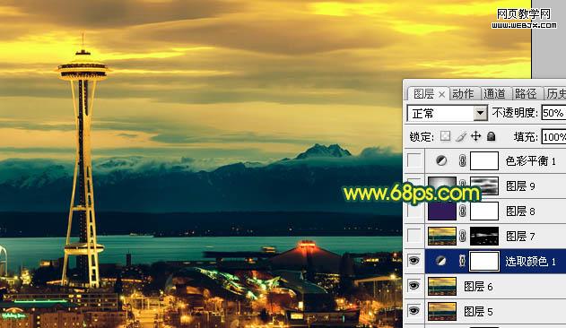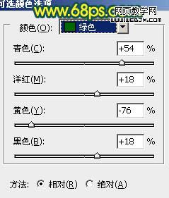 10、新建一個圖層,蓋印圖層。選擇菜單:圖像 > 模式 > RGB顏色,確定后創建可選顏色調整圖層,對黃,綠進行調整,參數設置如圖15,16,確定后把圖層不透明度改為:50%,效果如圖17。