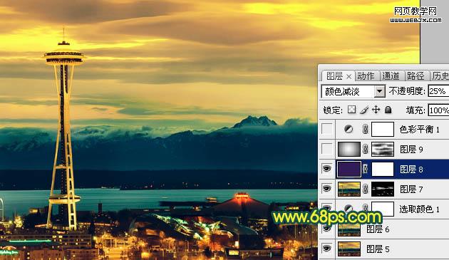 12、新建一個圖層,填充顏色:#321C57,圖層混合模式改為“顏色減淡”,不透明度改為:25%,效果如下圖。