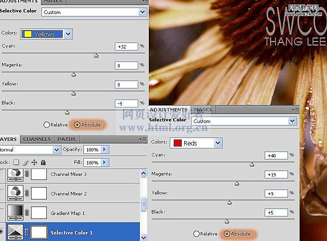 4、創建創建可選顏色調整圖層,在絕對模式下對紅,黃進行調整,參數及效果如下圖。