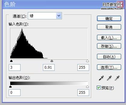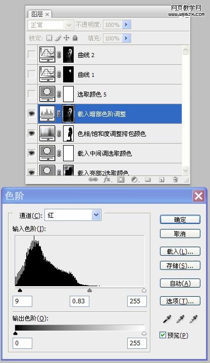 10、載入“暗部”選區,添加“色階”調整圖層,按照設置參數調整人物頭發顏色,使之與周圍環境光融合。如圖所示: