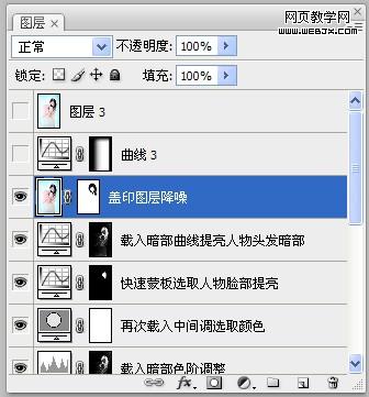 13、蓋印圖層,進行降噪處理,同時,添加圖層蒙板,選擇柔角畫筆,前景色為黑色,選擇適當的不透明度,將頭發和人物五官部分擦試出來。如圖所示: