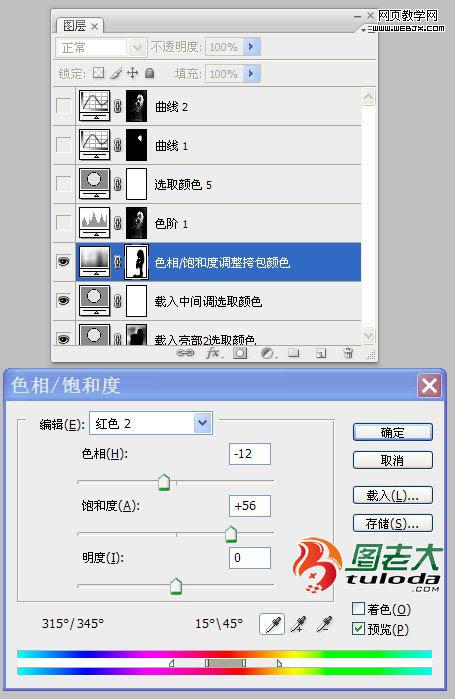 9、添加“色相飽和度”調整圖層,按照設置參數調整挎包顏色,使顏色更加飽滿,起到點綴畫面和人物的作用。然后進入圖層蒙板,選擇柔角畫筆,前景色為黑色,選擇適當的不透明度,將不需要的部分擦試出來。如圖所示: