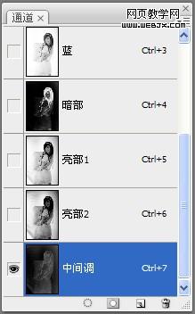 3、在進行這一步之前,用計算的方法,先選取照片的暗部、亮部和中間調選區,并存儲為新通道。其中:亮部選區計算兩次,目的是能夠更好的調試背景。