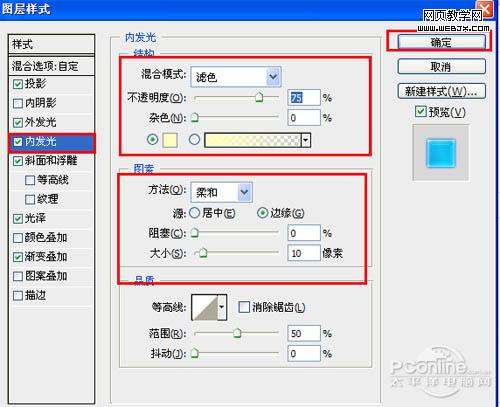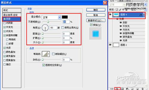 3、接著右擊圖層4,選擇混合選項,進入到圖層樣式,分別勾選投影、外發光、內發光、斜面與浮雕、光澤、漸變疊加選項,設置圖層樣式各項的值,參考下面的設置值,然后點擊確定按鈕,如圖4、5、6、7、8、9所示。效果圖如圖10所示。