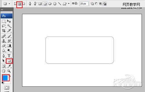 2、在圖層面板上單擊創建新圖層按鈕,新建一個圖層4,再工具箱選擇圓角矩形工具,并按住鍵盤中Shift不放在工作區拖出一個圓角矩形,按鍵盤快捷鍵Ctrl+Enter轉換為選區,設置前景色為藍色,按鍵盤快捷鍵Ctrl+D取消選區,如圖2所示。效果圖如圖3所示。